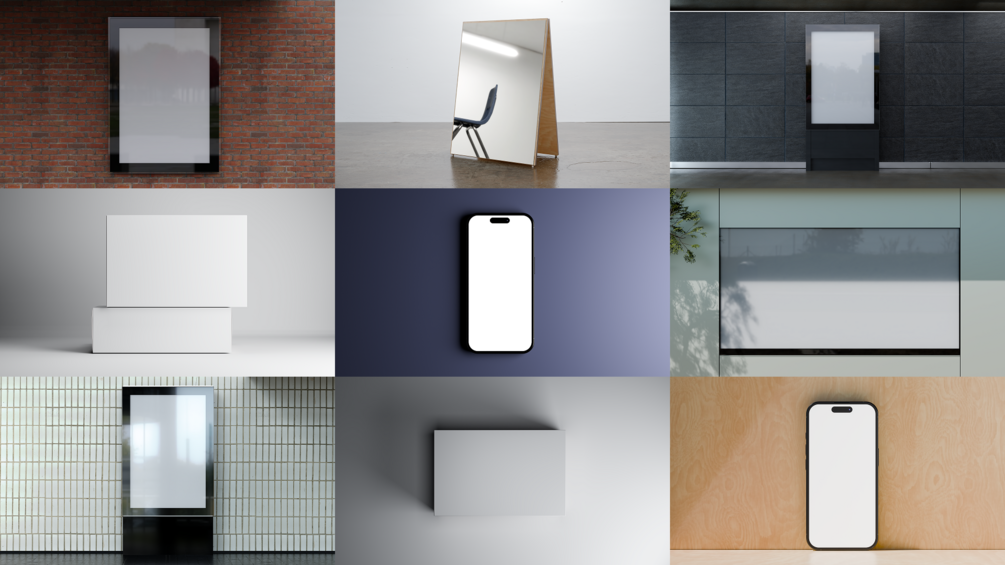 This collection includes 9+ mockups. You’ll get a variety of vertical and horizontal OOH placements, packaging, iPhone mockups, and a mirrored pop-up stand.